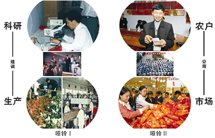 “雙啞鈴”即為“農(nóng)戶—公司—市場、科研—培訓(xùn)—生產(chǎn)”的模式,前者以公司提供的社會(huì)化服務(wù)為紐帶,產(chǎn)品按“農(nóng)戶—公司—市場”的順序流動(dòng),形成“紅薯產(chǎn)業(yè)鏈”——農(nóng)戶把紅薯賣給淀粉加工大戶,加工大戶把紅薯粗加工后,制成淀粉交售給企業(yè),企業(yè)經(jīng)過大規(guī)模工業(yè)化精加工,制成方便粉絲等薯類食品,將農(nóng)戶的紅薯商品化,導(dǎo)入市場,規(guī)避農(nóng)戶直接進(jìn)入市場的風(fēng)險(xiǎn);后者以公司開發(fā)的新技術(shù)信息為橋梁,按照“科研—培訓(xùn)—生產(chǎn)” 的順序流動(dòng),市場需求推動(dòng)企業(yè)研發(fā)新技術(shù),新技術(shù)通過有計(jì)劃、有組織地培訓(xùn)農(nóng)戶,使農(nóng)戶掌握現(xiàn)代生產(chǎn)技術(shù),將科研轉(zhuǎn)化為生產(chǎn),由一個(gè)企業(yè)加工變?yōu)槌汕习偃f農(nóng)戶參與加工,使勞動(dòng)力得到有機(jī)分配,通過技術(shù)培訓(xùn)和基地建設(shè),推廣紅薯良種,使紅薯價(jià)值增漲12倍。